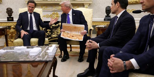 Le président américain, Donald Trump, montre une représentation de sa proposition de salle de bal à la Maison Blanche, lors de sa rencontre avec le secrétaire général de l’OTAN, Mark Rutte, à Washington, le 22 octobre 2025.