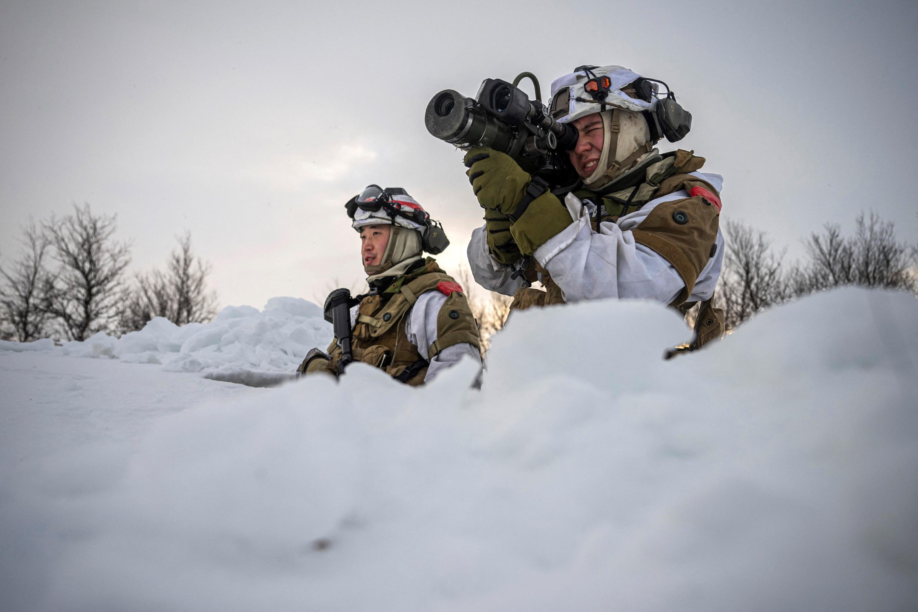 Des soldats de la Garde nationale norvégienne en exercice au-delà du cercle polaire arctique, le 8 mars 2024. «Il suffirait de 500, 800, ou 1000 soldats d’un contingent Nordefco formé pour opérer dans ces zones de grand froid pour mailler le territoire [du Groenland]», selon le chercheur Mikaa Blugeon-Mered.