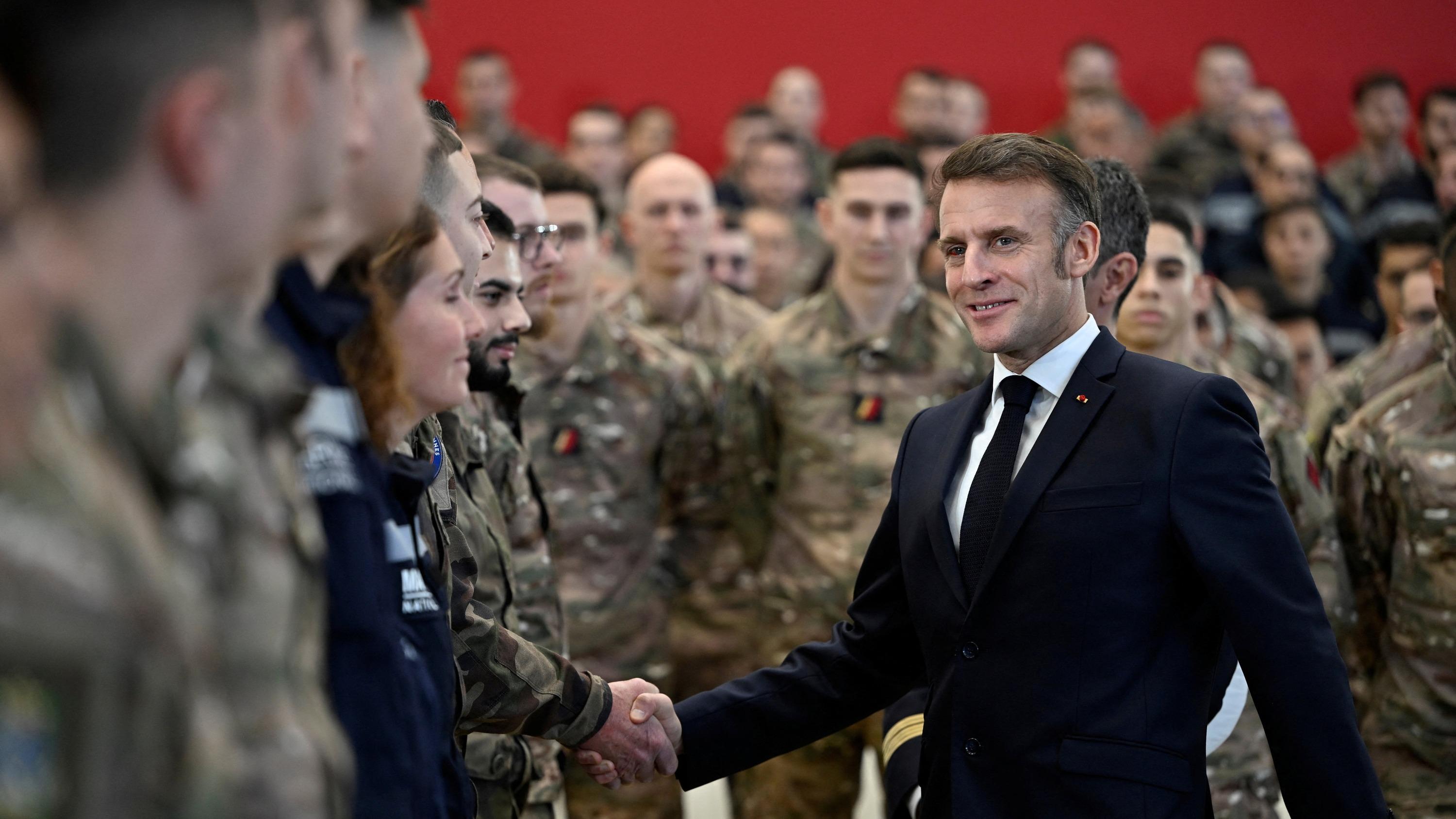 Le président français Emmanuel Macron serre la main des soldats lors de sa visite à la base aérienne militaire d’Istres, dans le sud de la France, le 15 janvier 2026.
