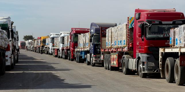 Des camions transportant de l’aide humanitaire et du carburant font la queue à la frontière de Rafah, côté égyptien, pour entrer dans la bande de Gaza, le 29 janvier 2026.