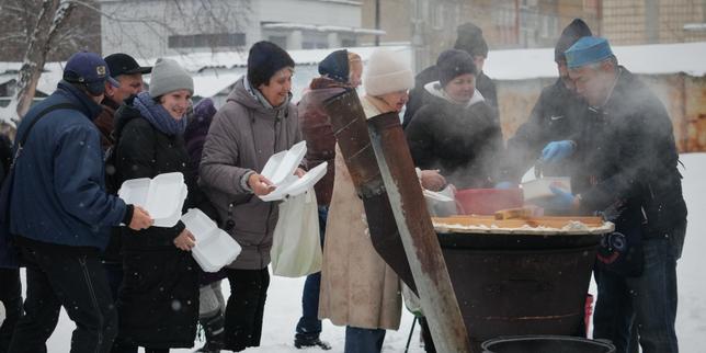 Des bénévoles servent de la nourriture à des habitants de Kiev pendant une coupure d’électricité causée par les attaques de la Russie contre le réseau énergétique du pays, le 7 février 2026.