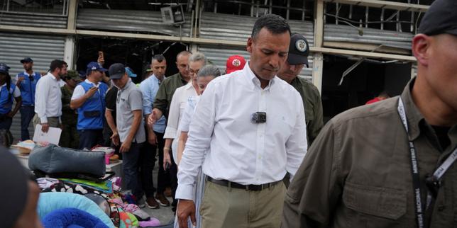 Le ministre colombien de la Défense, Pedro Sanchez, inspecte les dégâts près de la base de l’armée de l’air après l’explosion d’un camion piégé attribuée à des groupes dissidents des FARC, qui a fait plusieurs victimes lors d’une des deux attaques coordonnées, à Cali, en Colombie, le 22 août 2025.