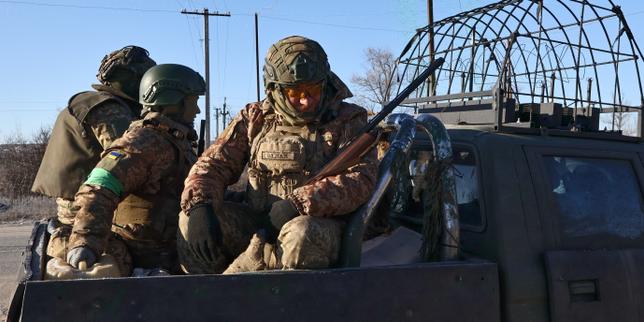 Des soldats en mission dans la région de Zaporijia (Ukraine), le mardi 10 février 2026. Photo fournie par le service de presse de la 65ᵉ brigade mécanisée ukrainienne.