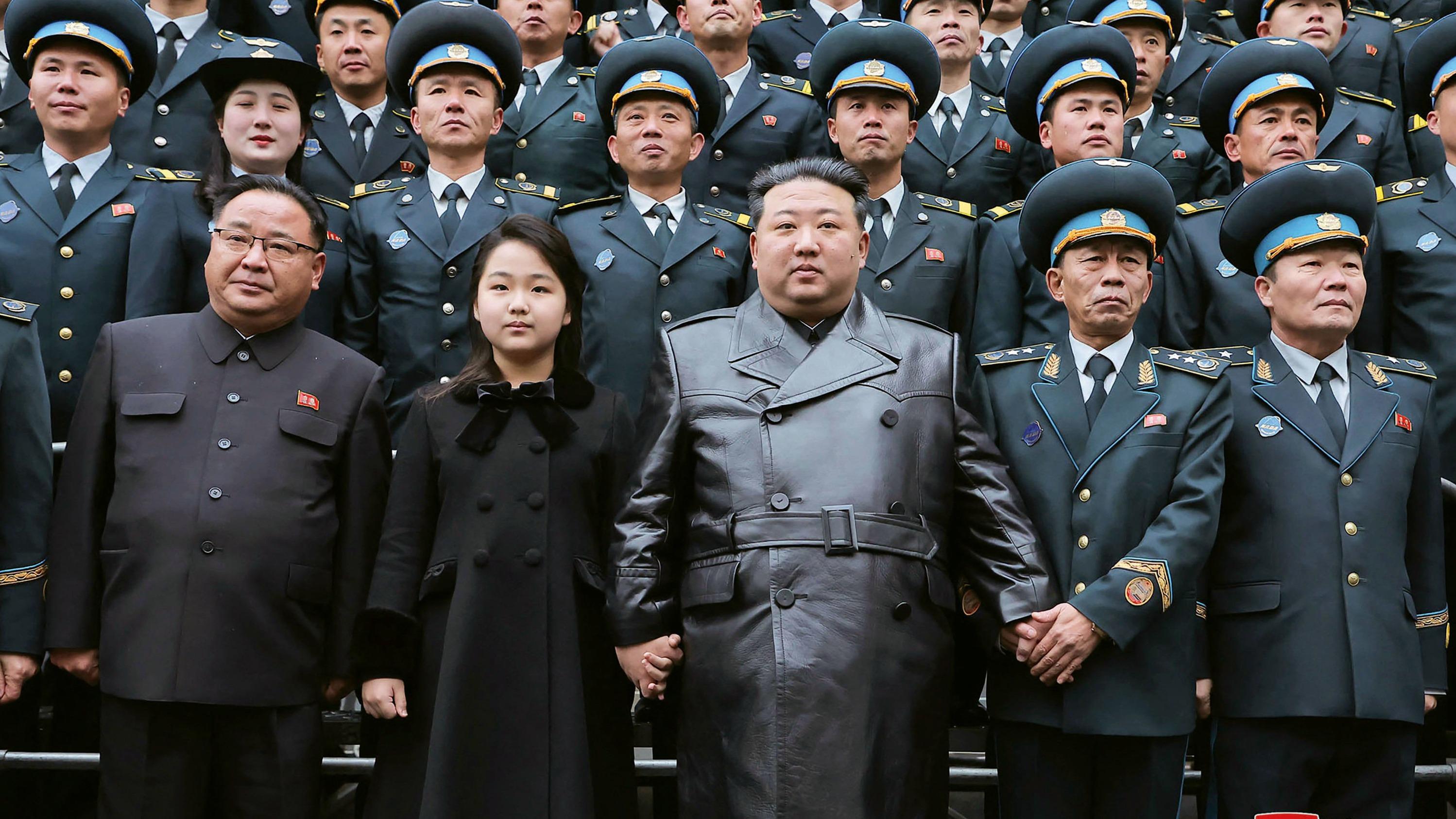 Kim Jong-un (au centre) et sa fille (2e à gauche), Ju-ae, posent avec des scientifiques ayant contribué au lancement d’un satellite de reconnaissance, à la Direction nationale des technologies aérospatiales, à Pyongyang, le 23 novembre 2023.
