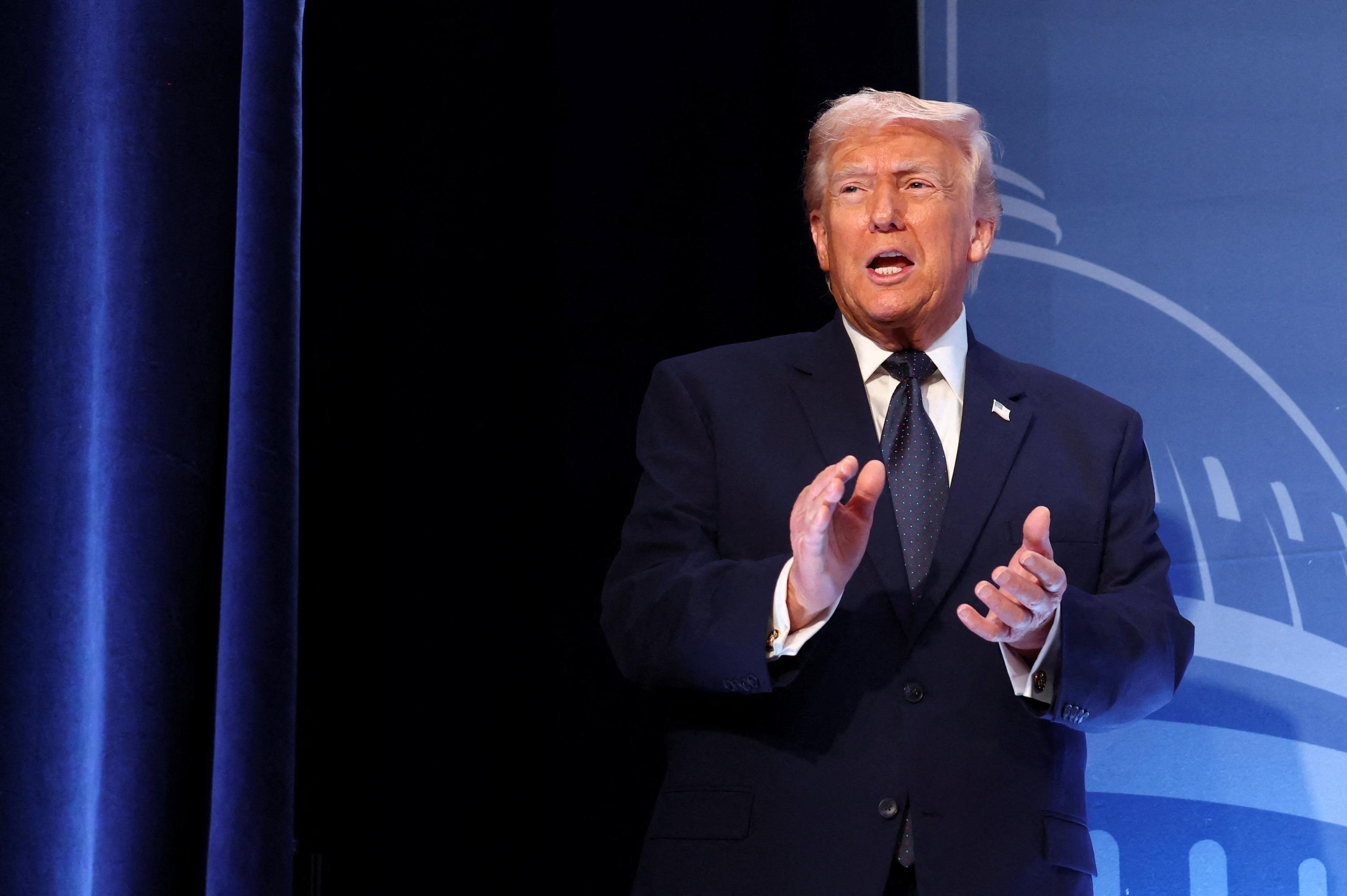 Donald Trump se dirige vers le pupitre pour une conférence de presse, à Doral (Floride), le 9 mars 2026.
