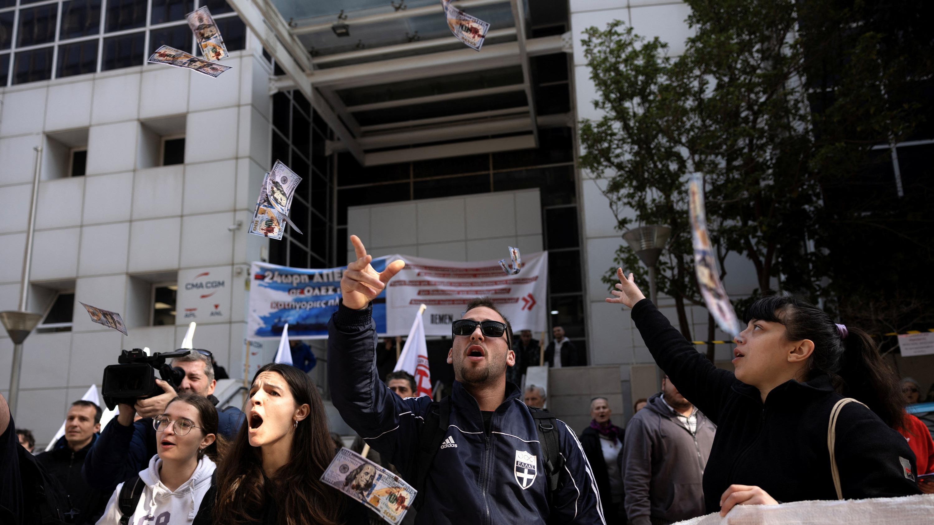 Des marins grecs lancent de faux billets de dollars en l’air lors d’une manifestation devant le siège de l’Union des armateurs grecs.