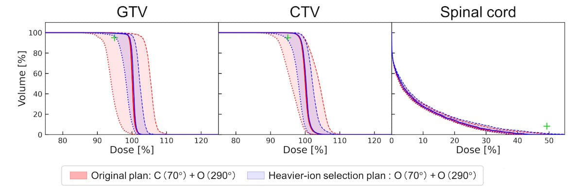 The heavier-ion selection plan proved the most effective in mitigating the effects of range uncertainty, substantially narrowing the dose uncertainty bands compared with the original plan. The team attribute this to the inherently higher LETd in heavier ions, making the 90 keV/µm target easier to achieve with oxygen-ion beams alone. The other plan modifications led to limited improvements.