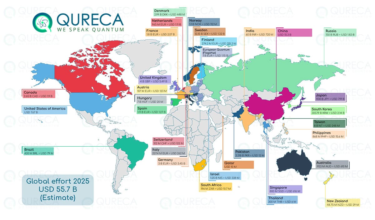 With data from a number of international reports and studies, quantum education and skills firm QURECA has summarized key programmes and efforts around the world. These include total government funding spent through 2025, as well as future commitments spanning 2–10 year programmes, varying by country. These initiatives generally represent government agencies’ funding announcements, related to their countries’ advancements in quantum technologies, excluding any private investments and revenues.