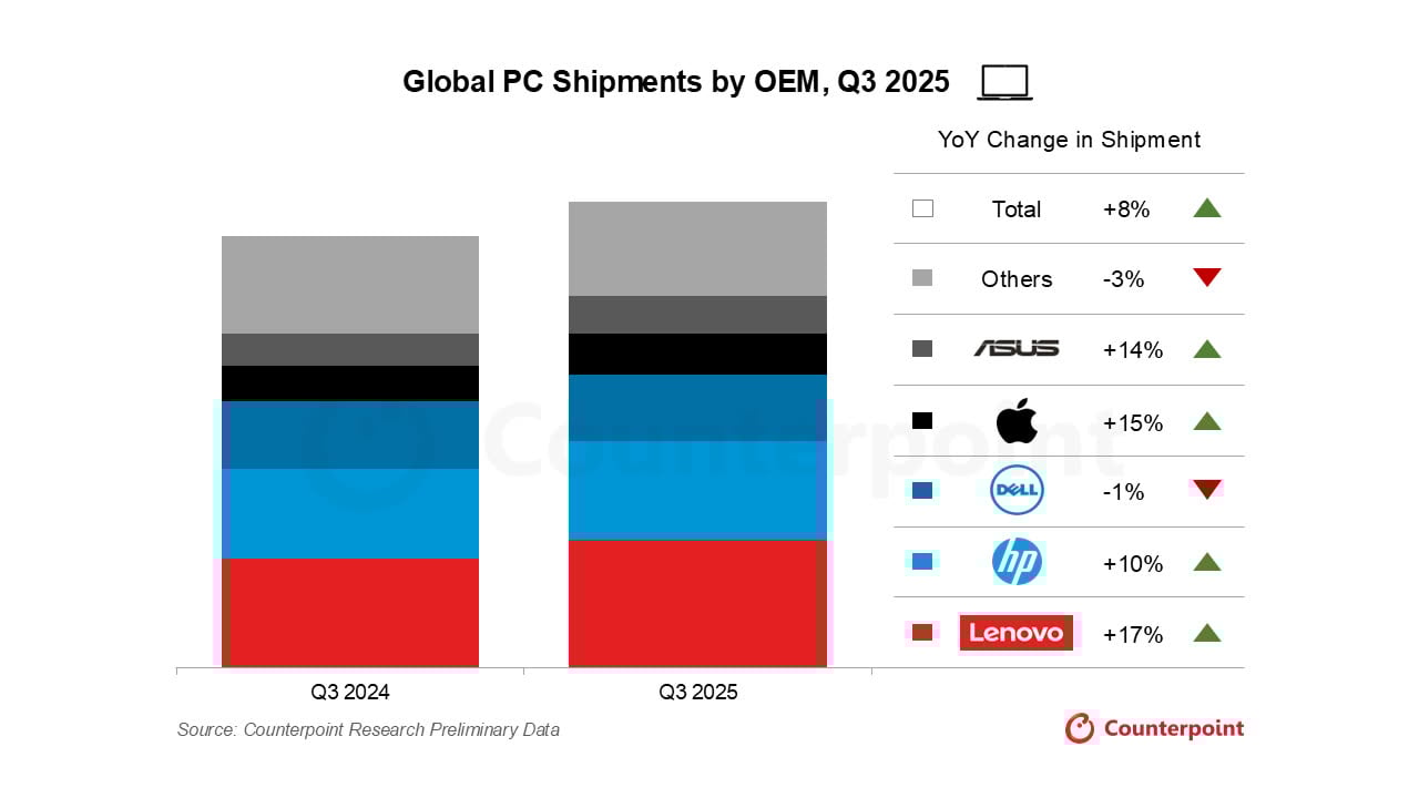 D’après les chiffres publiés par Counterpoint Research, l’abandon de Windows 10 profite clairement à Apple. Les livraisons de Mac ont progressé d’environ 15 % au troisième trimestre 2025 — seule Lenovo fait mieux, avec une hausse de 17 %.