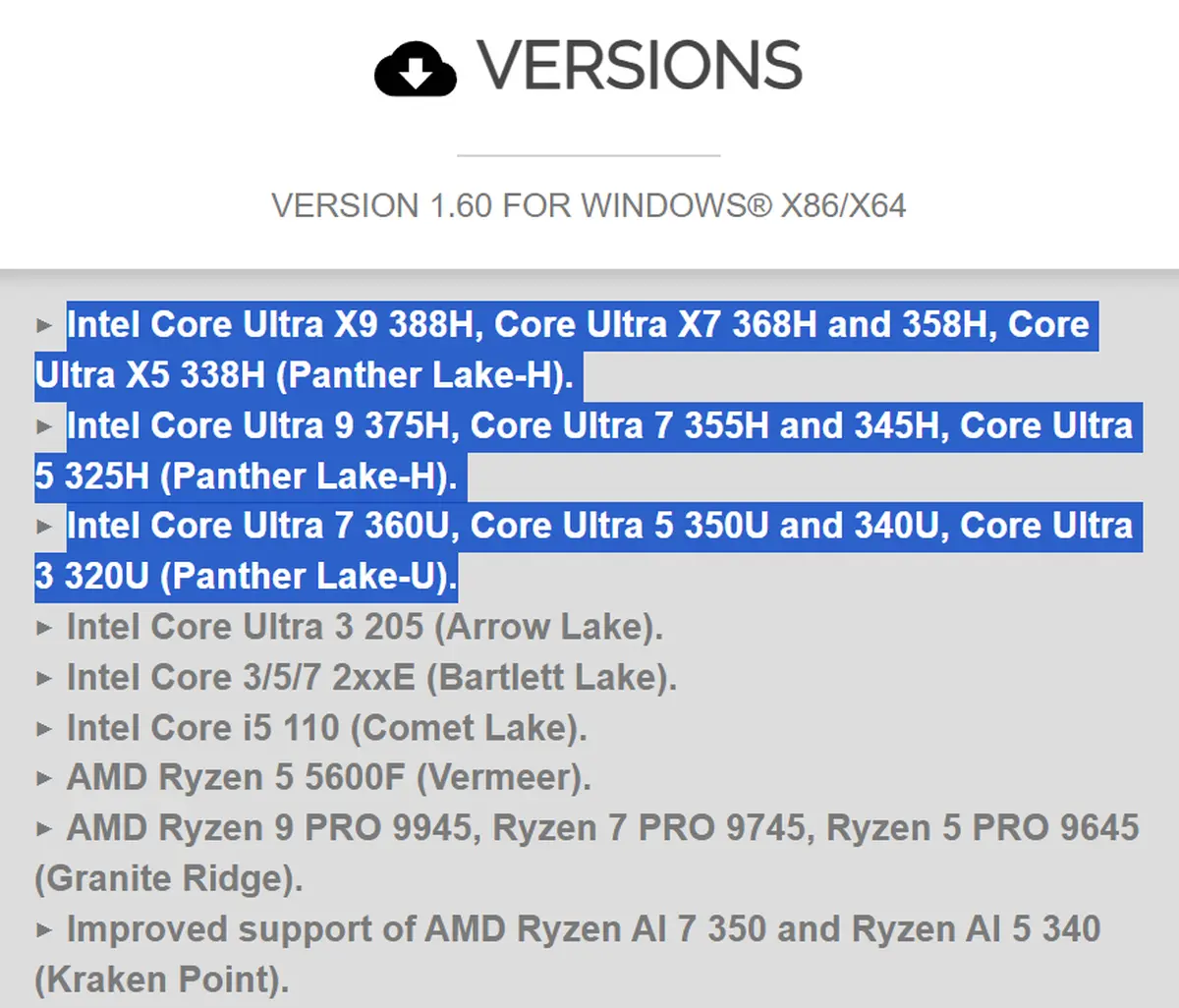 Le changelog de HWMonitor 1.6 fait apparaître trois familles pour Panther Lake : deux séries H et une série U. La liste des SKUs y est explicitement prise en charge, un indicateur fort que les appellations sont figées côté Intel. Les variantes estampillées « X » se distinguent par leur partie graphique : 10 à 12 cœurs Xe contre 4 Xe pour les modèles sans « X », de quoi dessiner deux niveaux de performance iGPU assez nets.
