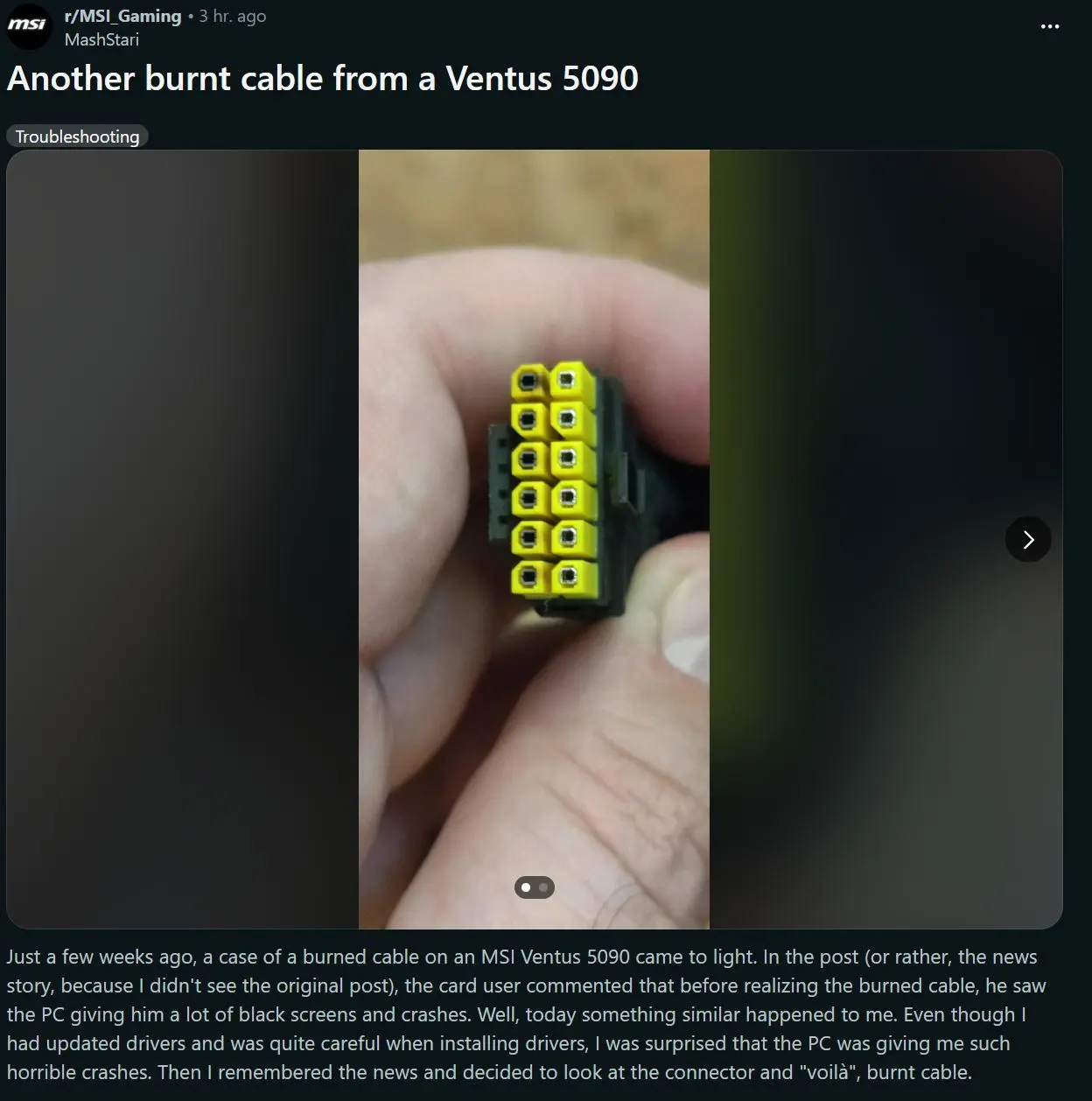Les témoignages, tous publiés sur Reddit, visent cette fois les RTX 5090 de plusieurs marques, avec des alimentations variées. Après le cas évoqué hier de la Sapphire RX 9070 XT NITRO+, un utilisateur de PNY RTX 5090 raconte des semaines d’écrans noirs et de plantages avant de retirer la carte et de découvrir une prise 12 broches noircie sur une rangée..Ah pas une explosion de condensateur, cette fois… Un autre, équipé d’une MSI RTX 5090 Ventus 3X, décrit des mois de micro-coupures d’image et de scintillements, jusqu’au plantage total et à la découverte d’un connecteur fondu.