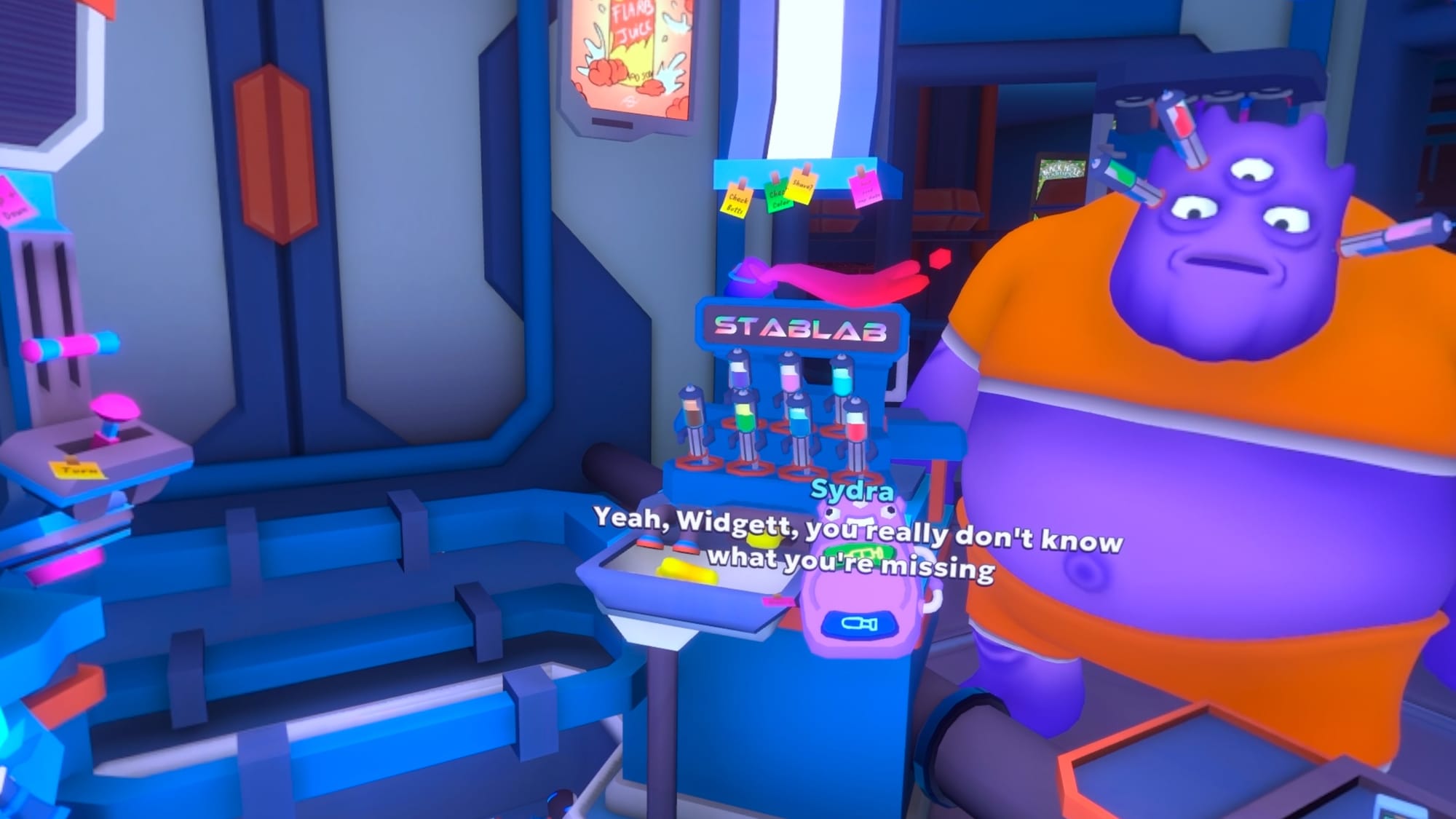 Next, you’re introduced to a colorful cast of silly coworkers, each with exaggerated personalities. The tone in these first five minutes is instantly reminiscent of vintage Futurama (which I love). Your new friends are an offbeat, ragtag group of misfits dumped into the same metaphorical sinking ship. The characters’ designs are expressive and fun, their dialogue is snappy and delivered perfectly by their voice actors, and the space station environment brims with small gags and visual jokes.