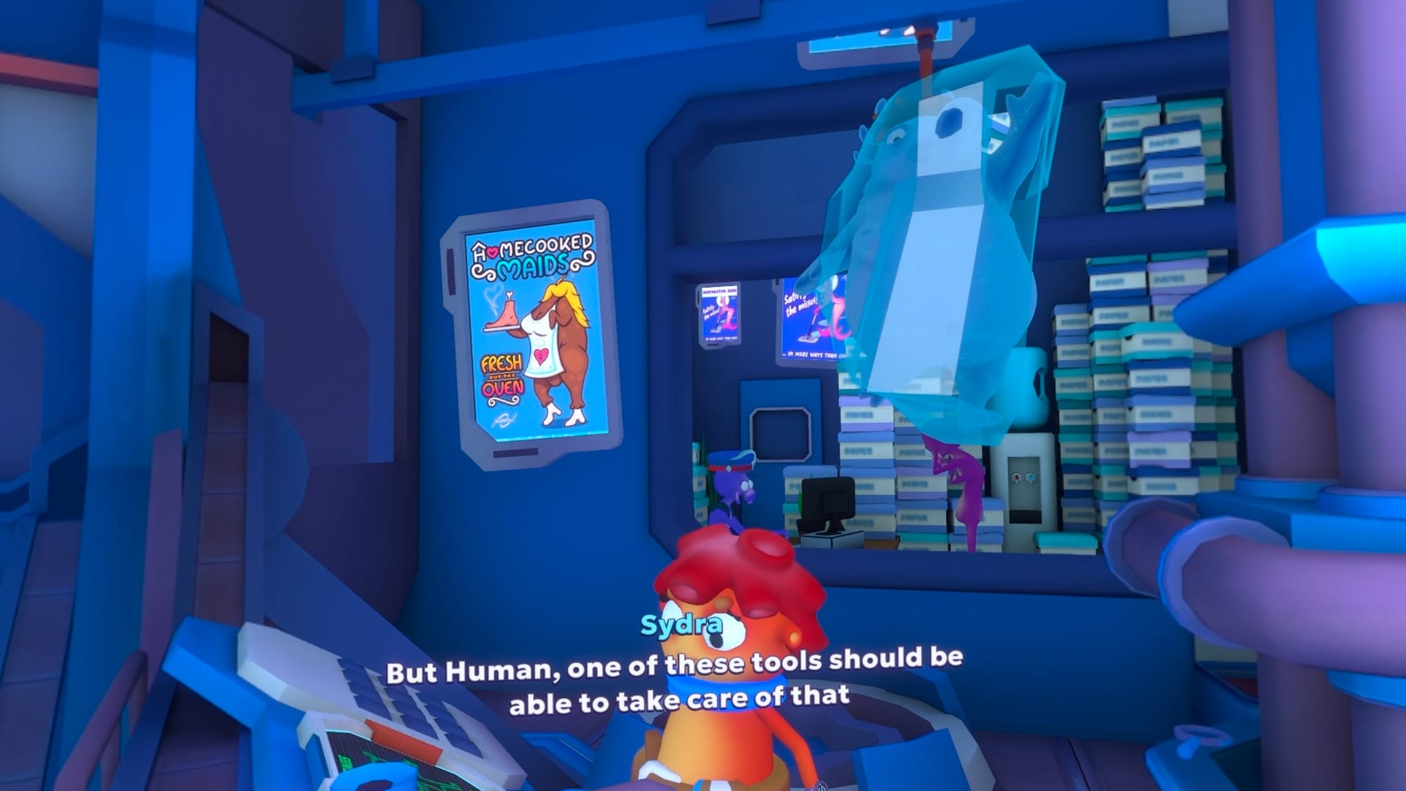The mechanics of this process are well-crafted, with all our tools and devices (yes, even the butt plugs) reacting well in VR. The tools that we use are silly, fun to use, and inventive, and the fully voice-acted abductees are highly varied and do their best to say stupid, fun, or funny things. Our coworkers are there as well, helping us in their own way, and throughout the process we’re learning more about them and the overarching story of Space Control.