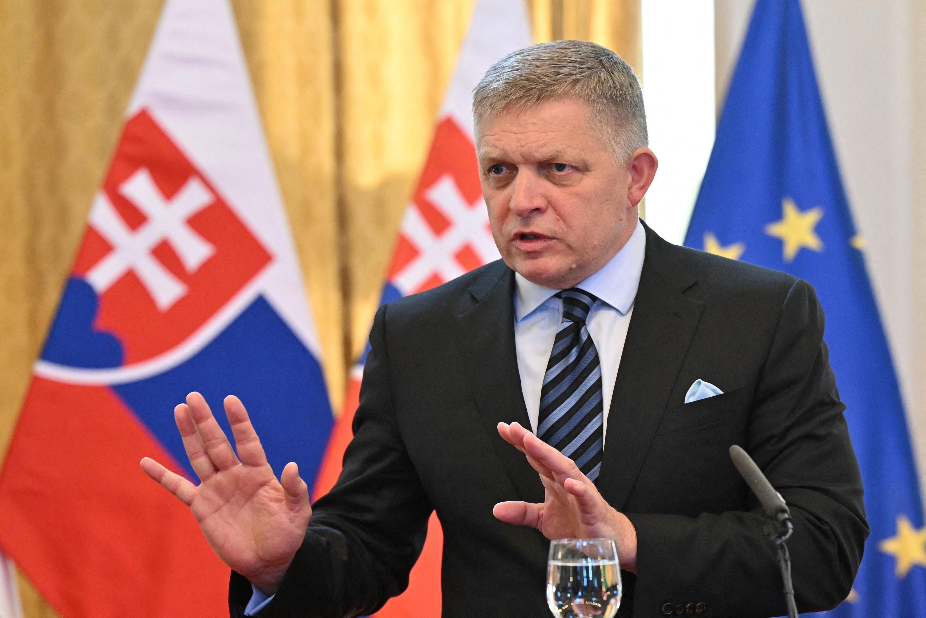 Le premier ministre slovaque Robert Fico lors d’une conférence de presse après une rencontre avec son homologue hongrois Viktor Orban, à Bratislava, le 28 avril 2025.