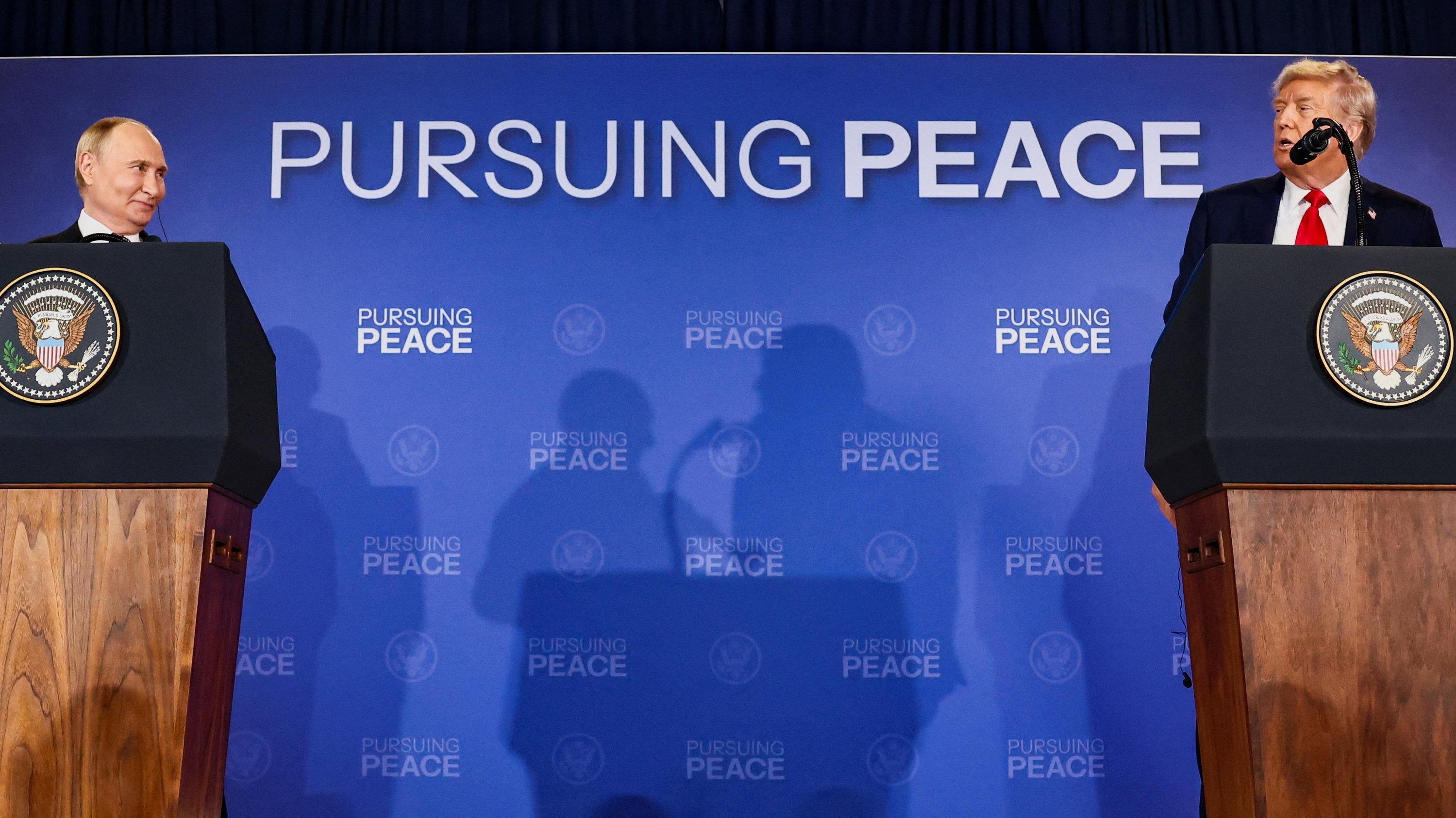 Donald Trump lors d’une conférence de presse conjointe avec Vladimir Poutine après leur participation au sommet américano-russe sur l’Ukraine d’Anchorage, en Alaska (États-Unis), le 15 août 2025.