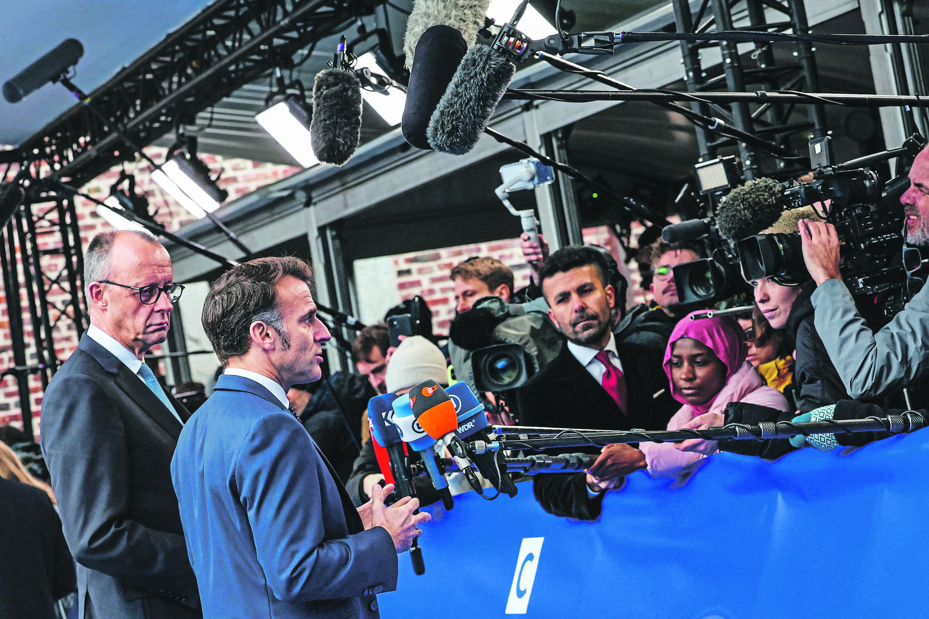 Le chancelier allemand, Friedrich Merz et Emmanuel Macron d’adressent à la presse, le 12 février, lors du sommet de l’Union européenne, au château d’Alden Biesen, en Belgique.