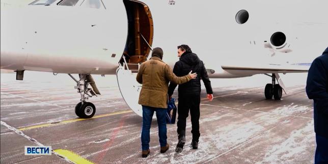 Sur cette image, diffusée par le Service fédéral de sécurité russe (FSB) via la chaîne Russia-1 le 8 janvier 2026, on aperçoit le chercheru français Laurent Vinatier (à droite) après sa libération de prison, dans le cadre d’un échange de prisonniers avec la France.