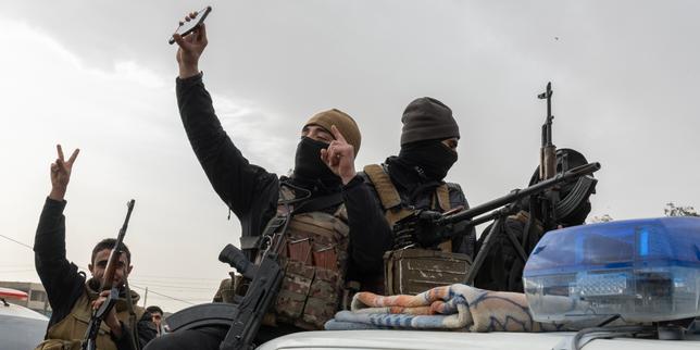 Des éléments du premier convoi de membres des forces de sécurité du ministère de l’intérieur syrien passent (l’index levé vers le ciel) à Hassaké, en Syrie, le 2 février 2026.