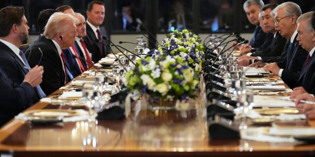 Le président américain, Donald Trump, lors d’un dîner avec des dirigeants de pays d’Asie centrale, dont le président du Kazakhstan, Kassym-Jomart Tokaïev (en face de Donald Trump), le 6 novembre 2025, à la Maison Blanche, à Washington.