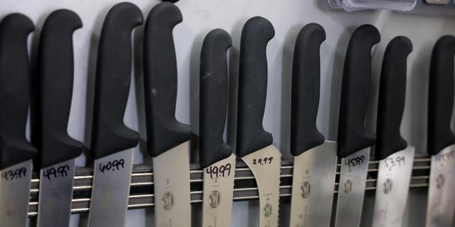 Des couteaux Victorinox, de fabrication suisse, exposés dans la boutique Sin Rival Cutlery à Miami (Etats-Unis), le 5 août 2025.