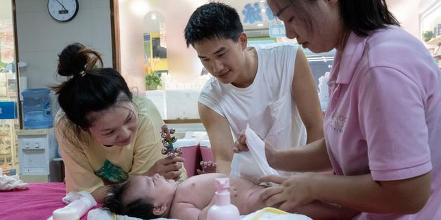 Zhang Yu, 27 ans, et son mari, Xiong Longji, 28 ans, ont emmené leur fille de 3 mois, Wanzi, dans un centre d'accompagnement des nouveaux-nés à Tianmen, le 9 octobre 2025.