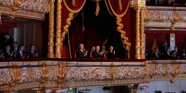 Le président russe, Vladimir Poutine, entouré de Kassym-Jomart Tokaïev, président kazakh, et d’Olga Lioubimova, ministre de la culture russe, au Théâtre Bolchoï, à Moscou, le 12 novembre 2025.