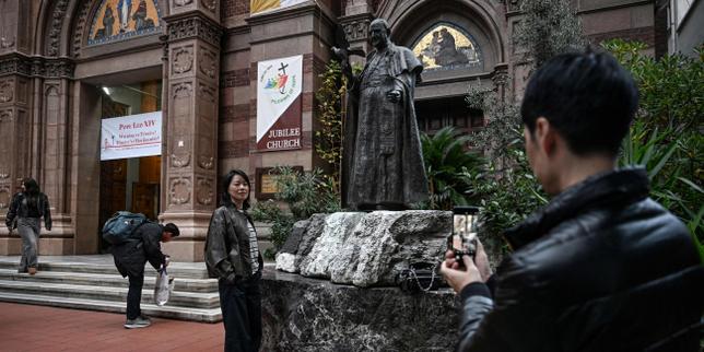 Devant la statue du défunt pape Jean XXIII, à l’extérieur de l’église Saint-Antoine-de-Padoue, tandis qu’une banderole de bienvenue à Léon XIV trône, avant sa visite en Turquie. A Istanbul, le 24 novembre 2025.