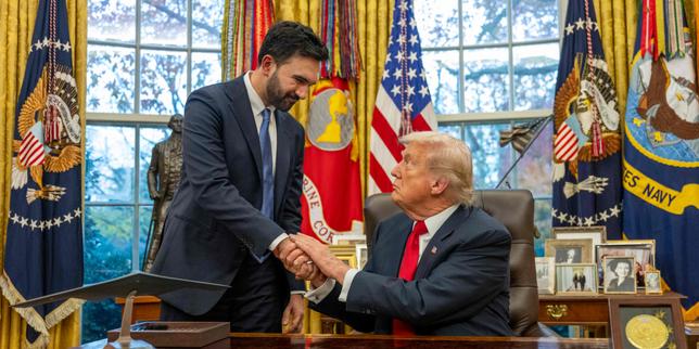 Le président américain, Donald Trump, serrant la main du nouveau maire démocrate de New-York, Zohran Mamdani, à la Maison Blanche, à Washington, le 21 novembre 2025.