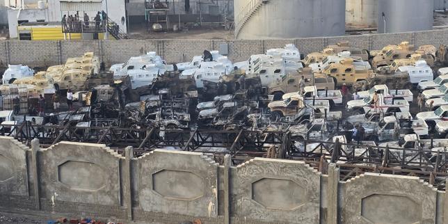 Des véhicules militaires endommagés à la suite d’une frappe aérienne menée par une coalition dirigée par l’Arabie saoudite, dans le port de Moukalla, au Yémen, le 30 décembre 2025.