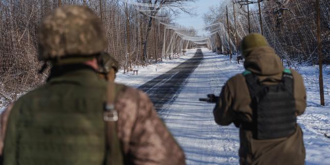Des militaires d’une unité blindée de la 93e brigade mécanisée indépendante des forces armées ukrainiennes marchent sous un filet anti-drones, près de la ligne de front dans la région de Donetsk (Ukraine), le 26 janvier 2026,