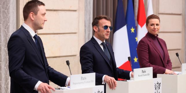 Jens-Frederik Nielsen, premier ministre groenlandais, Emmanuel Macron, président français, et Mette Frederiksen, première ministre danoise, à Paris, le 28 janvier 2026.