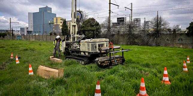 Opération de carottage, à Oullins-Pierre-Bénite (Rhône), pour analyser le sol dans le cadre d'une étude scientifique sur les PFAS, le 27 mars 2025.
