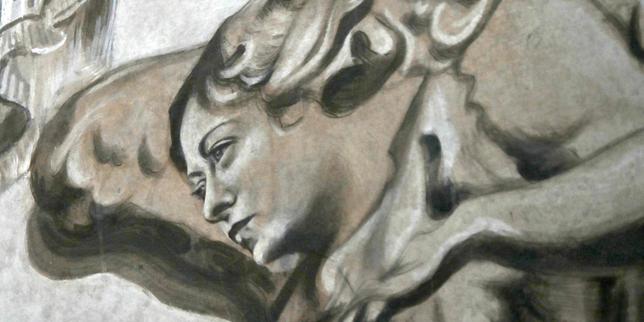 Un détail d’une fresque récemment restaurée dans la basilique San Lorenzo in Lucina où une victoire ailée ressemblerait à la présidente du conseil Giorgia Meloni, à Rome, le 31 janvier 2026.