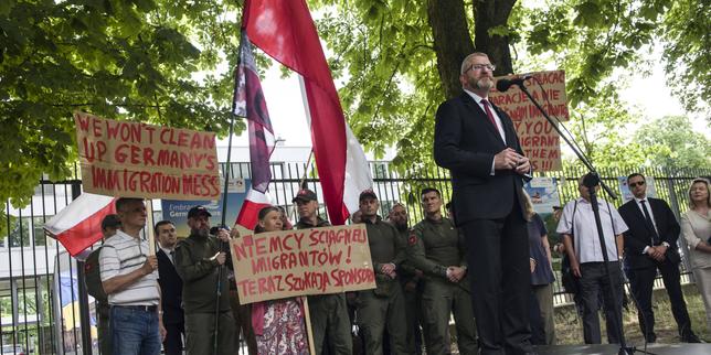 Grzegorz Braun, homme politique d’extrême droite, lors d’une manifestation antimigrants, sous le slogan « Halte à l’invasion de migrants allemands », à Varsovie, le 7 juillet 2025.