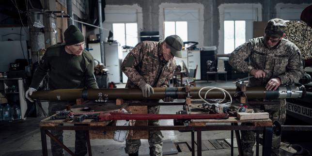 « Silex », 73 ans, Anatoli, 63 ans, et Petro, 67 ans, montent une roquette Grad, à la base du bataillon Loups des steppes, à Zaporijia (Ukraine), le 3 janvier 2026.