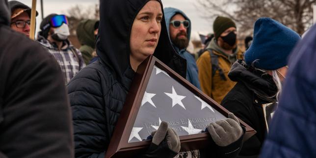 Une manifestante avec un drapeau américain en « triangle plié » en signe de deuil, à Minneapolis (Minnesota), le 15 janvier 2026.