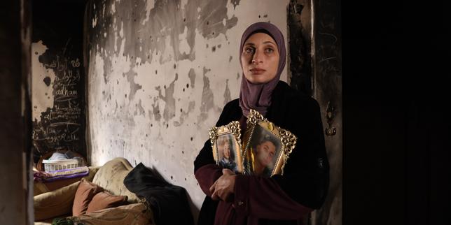 Tahrir Abou Madi, 40 ans, avec les portraits de ses enfants disparus, dans sa maison brûlée lors d’une incursion de l’armée israélienne en 2024 dans la bande de Gaza ; ici, le 30 janvier 2026.