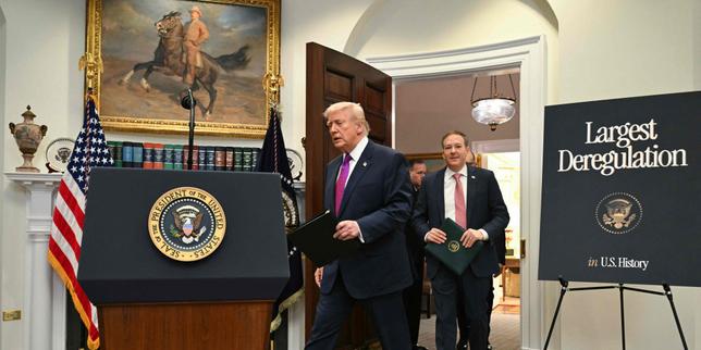 Le président Donald Trump, avant l’annonce l’abrogation du texte servant de fondement à la lutte contre les émissions de gaz à effet de serre aux Etats-Unis., à la Maison Blanche à Washington, le 12 février 2026.