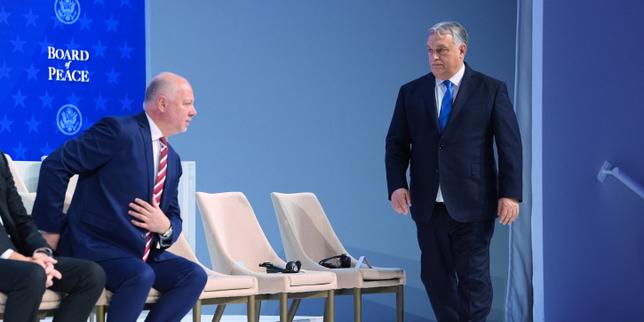 Le premier ministre hongrois, Viktor Orban, lors de l’annonce de la charte du Conseil de la paix par le président Donald Trump, au Forum économique mondial de Davos, en Suisse, le 22 janvier 2026.
