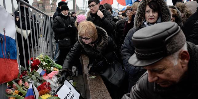 Le 1ᵉʳ mars 2015, des manifestants déposent des fleurs en mémoire du leader de l’opposition, Boris Nemtsov, sur le pont où il a été abattu quelques jours plus tôt, le 27 février 2015, près du Kremlin, à Moscou.