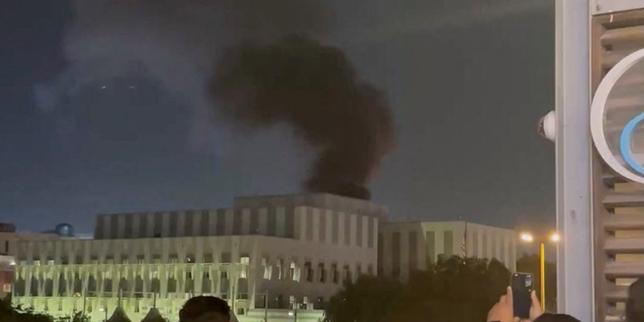 Des panaches de fumée s’élèvent des environs du consulat américain à Dubaï, aux Emirats arabes unis, dans le contexte du conflit israélo-américain avec l’Iran, le 3 mars 2026, comme le montre cette capture d’écran d’une vidéo diffusée sur les réseaux sociaux.
