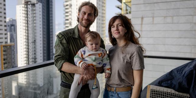 Noam Sobovitz, réserviste de 38 ans, sa femme, Hila Salomon, et leur fille Emmanuelle, à Bat Yam, le 4 mars 2026.