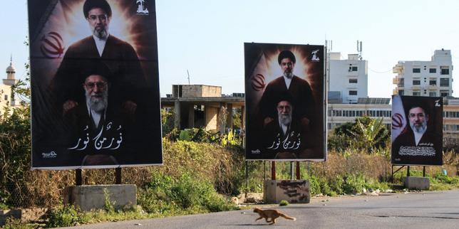Des affiches représentant l’ayatollah Ali Khamenei, Guide suprême iranien assassiné, et son fils et successeur, l’ayatollah Mojtaba Khamenei, à Sour (Tyr), ville côtière du sud du Liban, le 10 mars 2026.