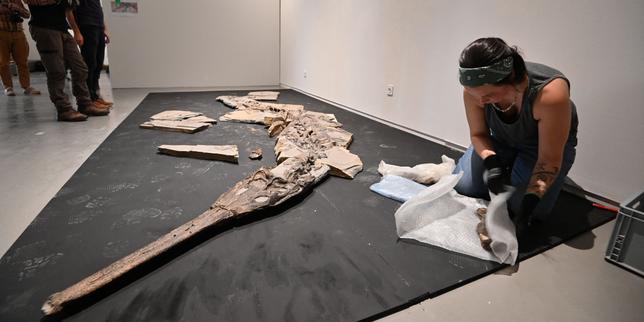 Camille Auclair, restauratrice de la société Kraniata, reconstitue le fossile d’un crocodile marin jurassique découvert dans le département de l’Hérault. Au musée de Lodève, le 10 octobre 2025.