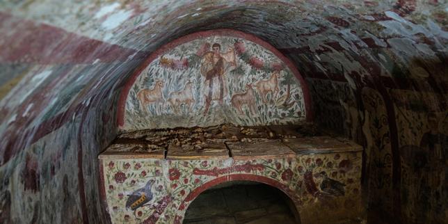 Une fresque représentant Jésus en Bon Pasteur sur le mur d’une tombe du IIIᵉ siècle, à la nécropole de Hisardere, à Iznik (Turquie), le 12 décembre 2025.