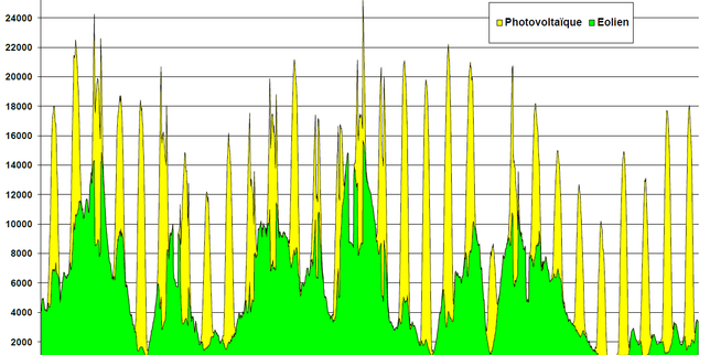 Regardons le vendredi 26 septembre 2025. Ce jour là, la production éolienne varie entre 700 MW et 2000 MW, une misère relativement aux 25 308 MW installés, toute la journée. Mais c’est aussi un jour nuageux, avec un maximum de production solaire à midi le deuxième plus bas du mois, avec 9 200 MW. Et, bien sûr, une production nulle durant toute la nuit, alors que la production éolienne demeure à son étiage bas également. On trouve la même situation le 21 septembre, comme les 8 et 9 du mois. A l’inverse, les 15 et 16, vents et soleil sont à leurs maxima mensuels en simultané.
