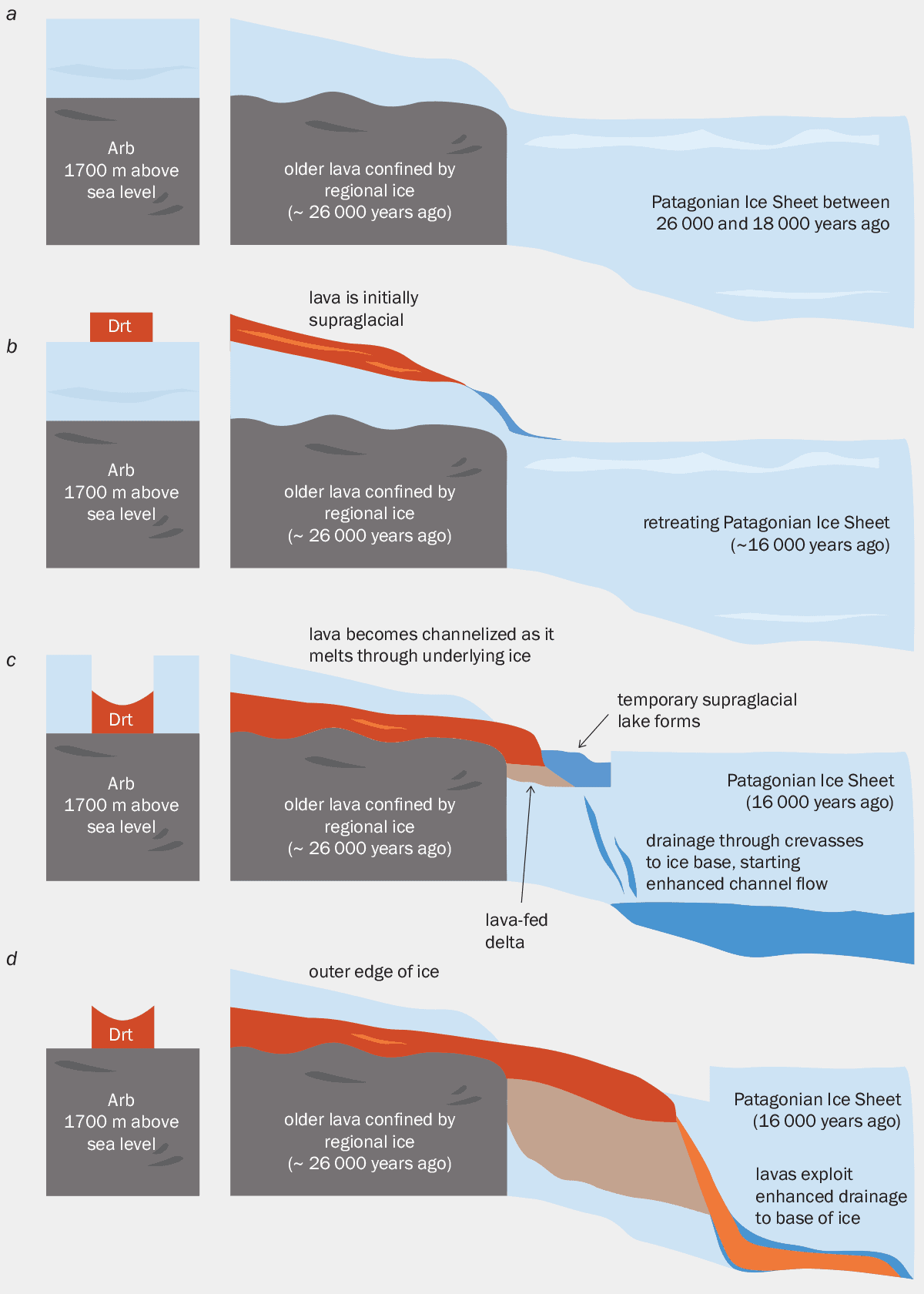 Geologist Brad Singer and colleagues are studying how glaciers and ice sheets impact the evolution of volcanoes, to develop a “lava-fed delta” model. (a) The researchers studied basaltic andesites in the Río Blanco river in Argentina (Arb). A fine-grained extrusive igneous rock that forms when volcanic magma erupts and crystallizes outside of the volcano, basaltic andesites were impounded by the Patagonian Ice Sheet roughly 26,000 years ago. Here they formed cliffs that were then occupied by the Patagonian Ice Sheet at 1500–1700 m above sea level between 26,000 and 20,000 years ago. Ice on top of the edifice should have been comparatively thinner than in the surrounding valleys. (b) As the ice sheet retreated between 18,000 and 16,000 years ago, dacite – a fine-grained volcanic rock formed by rapid solidification of lava that is high in silica and low in alkali metal oxides – from the Río Truful river in Chile (Drt) flowed onto it. (c) Lava is channelized as it melts the ice to form a lava-fed delta. (d) Dacite flows through the ice and to its base.