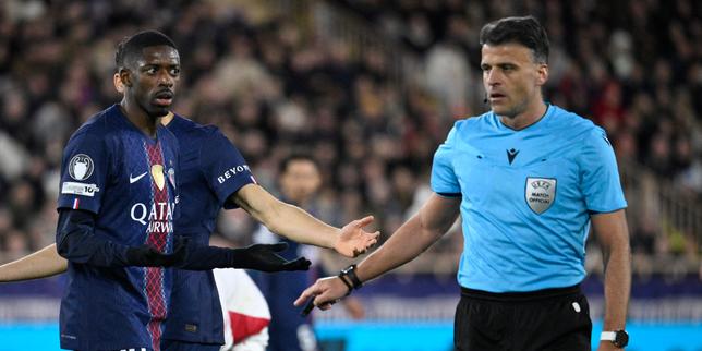 Ousmane Dembélé réagit à une décision de l’arbitre espagnol Jesús Gil Manzano lors du barrage aller de la Ligue des champions entre l’AS Monaco et le Paris Saint-Germain au Stade Louis II, le 17 février 2026.