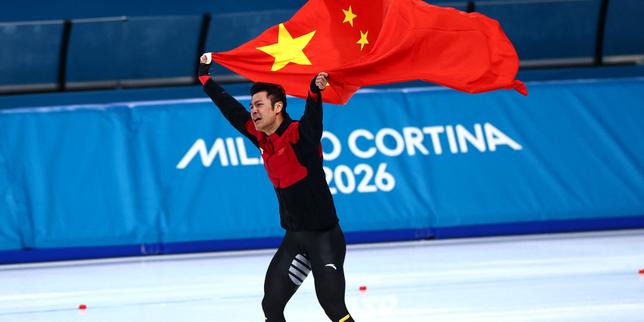 Zhongyan Nin célèbre sa victoire et son record olympique lors du 1500 m en patinage de vitesse à Milan (Italie), le 19 février 2026.