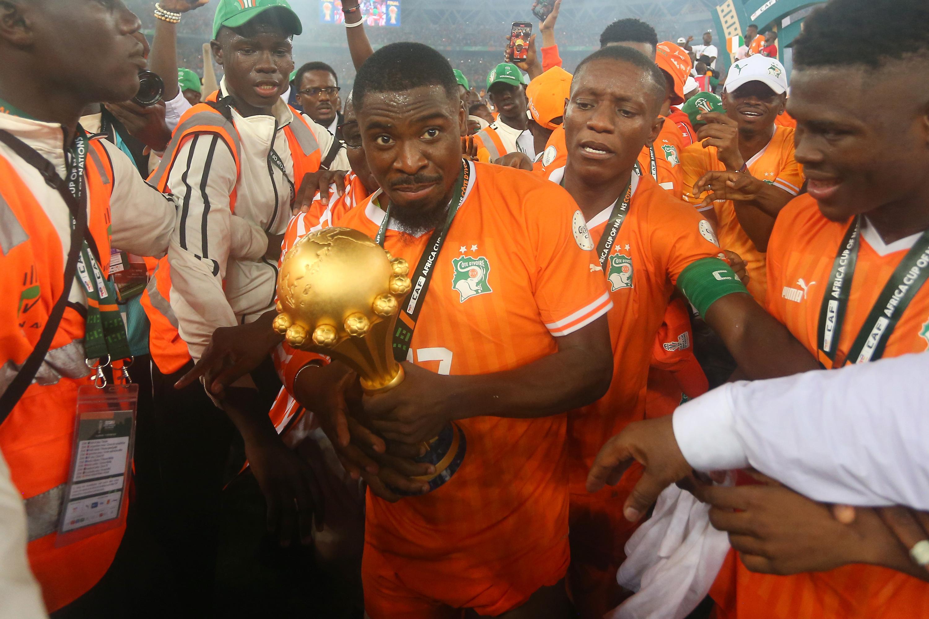 Serge Aurier avec le trophée de la Coupe d’Afrique des nations remportée par la Côte d’Ivoire en 2024.